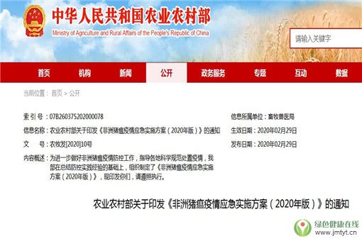 為進一步做好非洲豬瘟疫情防控工作,指導各地科學規范處置疫情,我部在總結防控實踐經驗的基礎上,組織制定了《非洲豬瘟疫情應急實施方案(2020年版)》,現印發你們,請遵照執行。《非洲豬瘟疫情應急實施方案(2019年版)》同時廢止。