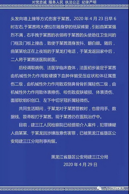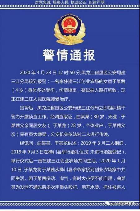 據(jù)三江公安微警務(wù)微信公號,黑龍江省墾區(qū)公安局建三江分局發(fā)布了有關(guān)女童被虐打案的最新通報,稱曲某某為發(fā)泄不滿先后多次用拳頭毆打、用開水燙、抓住被害人頭發(fā)向墻上撞等方式傷害于某茜。法醫(yī)初步鑒定,于某茜身體不同部位傷勢分別屬重傷二級、輕傷二級和輕微傷。