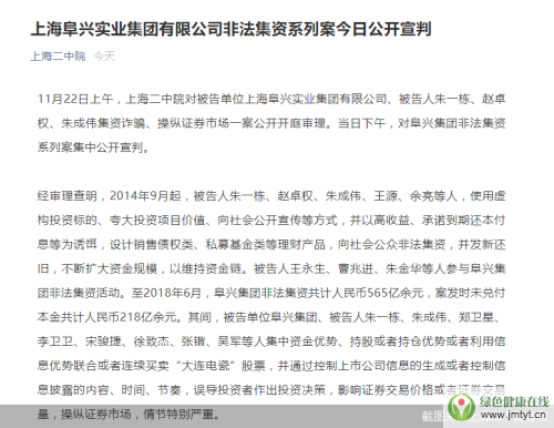 11月22日上午,上海二中院對阜興集團、被告人朱一棟、趙卓權、朱成偉集資詐騙、操縱證券市場一案公開開庭審理。當日下午,對阜興集團非法集資系列案集中公開宣判。