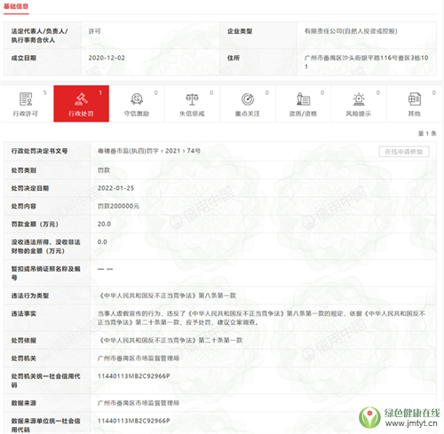 近日,信用中國網站發布一則行政處罰決定書,據粵穗番市監(執四)罰字〔2021〕74號顯示,廣州今朝健康產業科技有限公司存在虛假宣傳的違法事實,違反了《中華人民共和國反不正當競爭法》第八條第一款的規定。根據《中華人民共和國反不正當競爭法》第二十條第一款的規定,廣州市番禺區市場監督管理局對其處以罰款20萬元。