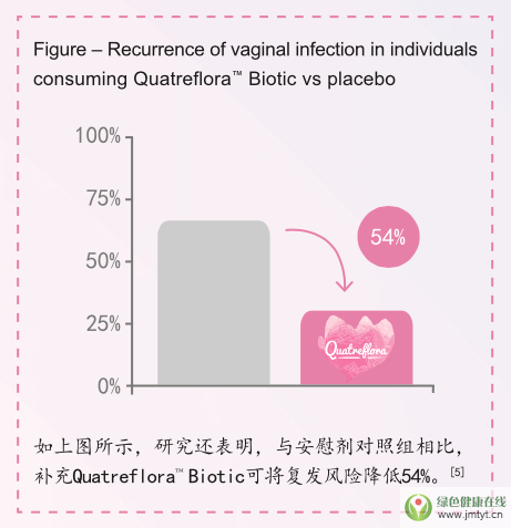 研究表明,經過第7天的服用,Quatreflora™ Biotic開始減少白色念珠菌的陰道定殖,服用第二個月后,白色念珠菌降低了74%,而安慰劑對照組降低了51%。