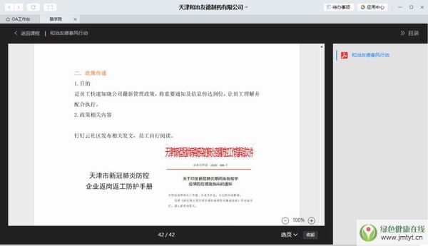 公司通過宣傳海報、溫馨提示牌、宣傳欄等靈活多樣的方式,在企業(yè)各個區(qū)域做好疫情防控宣傳工作,時刻落實疫情防控措施。同時公司還通過“釘釘云社區(qū)”平臺,積極組織員工在線學習《企事業(yè)單位復工復產(chǎn)疫情防控措施指南》、《天津市新冠肺炎防控企業(yè)返崗返工防護手冊》《新冠肺炎期間商務樓宇疫情防控措施指南》等文件,提升意識強化管理,凝心聚力共同戰(zhàn)疫。