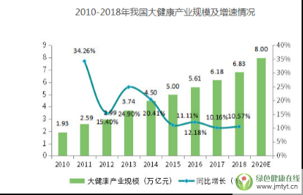 根據(jù)前瞻產(chǎn)業(yè)研究院數(shù)據(jù)顯示,2010年國(guó)內(nèi)大健康產(chǎn)業(yè)規(guī)模僅有1.93萬億,近幾年我國(guó)大健康產(chǎn)業(yè)得到了迅猛發(fā)展,社會(huì)各界響應(yīng),紛紛轉(zhuǎn)型進(jìn)入大健康領(lǐng)域。2017年國(guó)內(nèi)大健康產(chǎn)業(yè)總產(chǎn)值約6.18萬億元,2018年這一規(guī)模已經(jīng)超過6.83萬億元,預(yù)計(jì)到2020年,大健康產(chǎn)業(yè)有望突破8萬億元的產(chǎn)業(yè)規(guī)模目標(biāo)。