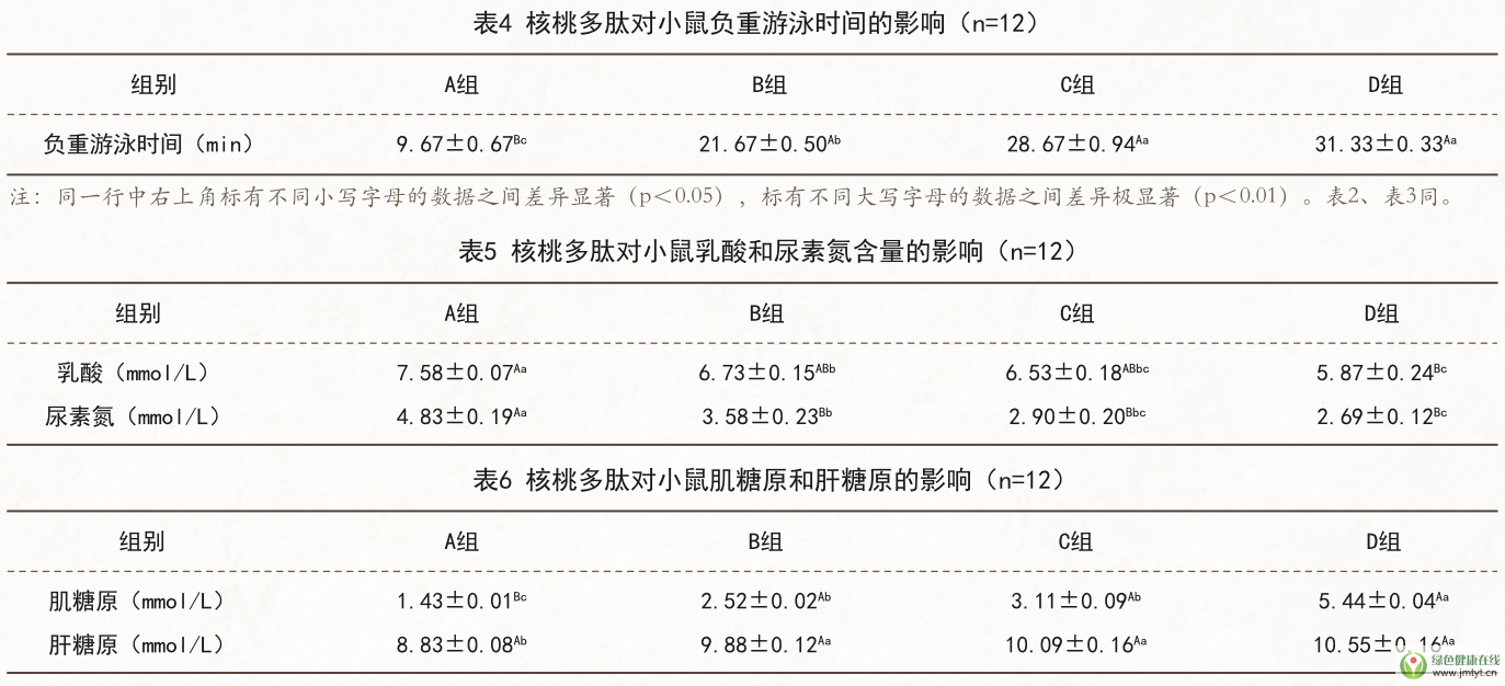 通過(guò)實(shí)驗(yàn),服用核桃多肽的實(shí)驗(yàn)小鼠負(fù)重游泳力竭時(shí)間均極顯著延長(zhǎng),血清尿素氮的含量顯著下降,血清乳酸含量顯著下降。再次驗(yàn)證了核桃多肽具有較好的抗疲勞功效。