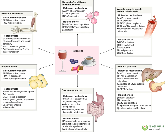 類黃酮在水果、堅果、種子、蔬菜、豆類及其油脂中含有5000多種不同的化合物,具有廣泛的分子和生理作用。富含類黃酮和其他植物化學物質的食物和飲食模式可以更好地控制體重,降低患T2DM的風險。動物和臨床研究表明,類黃酮對多種代謝相關的途徑均有影響,額外添加可防止動物模型的食源性體重增加,這可能與消耗能量相關的途徑有關,如腸道微生物或棕色脂肪。