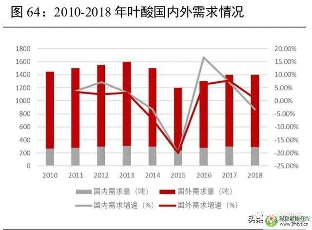 葉酸全球需求量隨葉酸價格的變化而有較大的波動性。在成本上漲、環保要求日益嚴格的情況下,由2014 年起,部分葉酸企業減產停產或退出市場,市場供應量下降,葉酸價格開始上漲。2015 年,環保因素導致部分葉酸供應商大幅減產,國內葉酸產量大幅下降,葉酸價格繼續飆升至 3000 元/kg 以上,在價格高壓下,下游飼料調配進行調整,僅在種畜中保留剛性添加,在家禽等飼料中幾乎不再添加,進而導致 2015年葉酸的整體需求規模大幅下降;與此同時,葉酸價格高企吸引 10 余家新產能進入,對供需格局造成沖擊,葉酸價格迅速回落,葉酸市場需求量隨之有一定回暖。此后由于環保影響因素仍在,價格在保持的同時仍有小幅波動。
