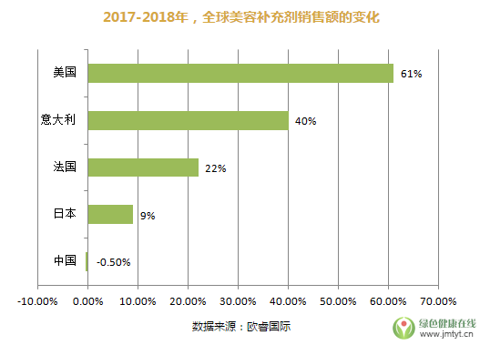 歐睿國際(Euromonitor International)調查數據顯示,2017年美國全年的銷售額不過8900萬美元,但在2018年美容補充劑產品銷售額達到了1.44億美元。其中2017年全球新推出的美容補充劑中,定位為美容產品的的維生素和膳食補充劑,日本占了20%,英國為11%,韓國為8%,美國為7%。