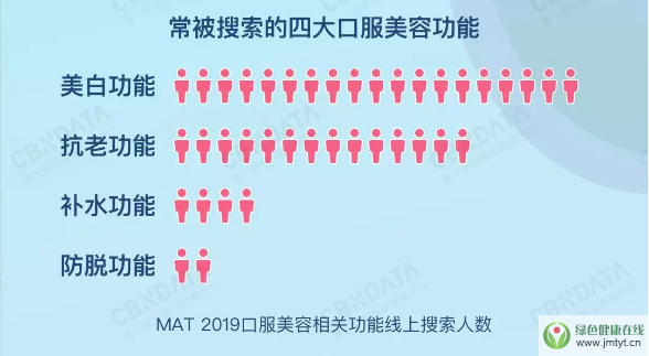 隨著消費者對口服美容產品的需求量越來越大,口服美容產品也開始朝著細分化、多元化方向發展,“抗皺”、“抗糖”、“抗衰老”、“抗氧化”等新鮮名詞逐漸闖進大眾視野,由此也催生出了一系列作用迥異的口服美容產品。根據CBNData《報告》顯示,線上口服美容品類最熱門的四大功效分別為“美白、抗老、補水、防脫”。其中,美白和抗老是消費人群對口服美容品類的最大需求。