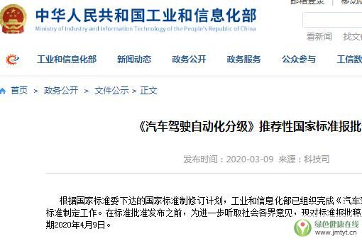 根據國家標準委下達的國家標準制修訂計劃,工業和信息化部已組織完成《汽車駕駛自動化分級》推薦性國家標準制定工作。在標準批準發布之前,為進一步聽取社會各界意見,現對標準報批稿及編制說明予以公示,截止日期2020年4月9日。