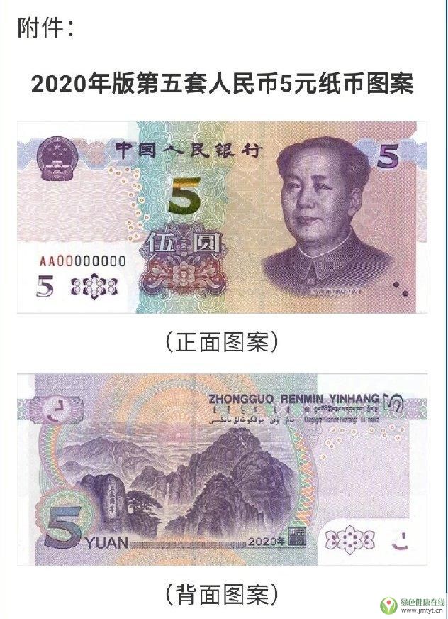 中國人民銀行定于2020年11月5日起發行2020年版第五套人民幣5元紙幣。2020年版第五套人民幣5元紙幣保持2005年版第五套人民幣5元紙幣規格、主圖案、主色調、“中國人民銀行”行名、國徽、盲文面額標記、漢語拼音行名、民族文字等要素不變,優化了票面結構層次與作用,提升了整體防偽性能。