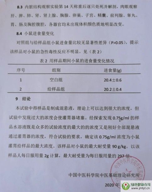 本試驗中得樣品是制成混懸液,理論上可以達到很大的濃度,但試驗中發現過大的濃度會使灌胃器堵塞。經探索發現0.75g/ml的樣品水溶液既是眾多的試驗濃度的最大的的濃度又是剛好全齢混懸液通過灌胃器的濃度,符合試驗的要求,確定該0.75g/ml濃度為小鼠灌胃給樣品的最大濃度。該樣品對小鼠的最大耐受量90g/kg。以該樣品人每日服用量2g計算,最大耐受量為每日服用量的297倍。