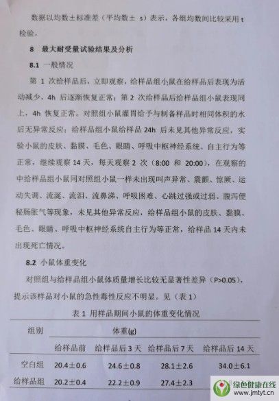 第1次給樣品后,立即觀察,給樣品組小鼠在給樣品后表現為活動減少,4h后逐漸恢復正常;第2次給樣品后給樣品組小鼠表現同上,4h恢復正常。對照組小鼠灌胃給予與制備樣品時相同體積的水后無異常反應;給樣品組小鼠給樣品24h后未見其他異常反應,實驗小鼠的皮膚、黏膜、毛色、眼睛、呼吸中樞神經系統、自主行為等正常,繼續觀察14天,每天觀察2次(8:00和20:00),在觀察的中給樣品組小鼠同對照組小鼠一樣未出現叫聲異常、震顫、驚厥、運動失調、流涎、流淚、流鼻涕、呼吸困難、心跳過強或過弱、腹瀉便秘腸脹氣等現象,未見其他異常反應,給樣品組小鼠的皮膚、黏膜、毛色、眼睛、呼吸中樞神經系統自主行為等正常,給樣品14天內未岀現死亡情況。