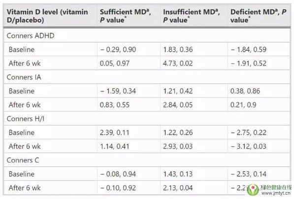 在基線水平上,CPRS及其分量表之間的差異不顯著(P > 0.05),而在6周后,與安慰劑組相比,對維生素D不足的患兒進行干預(yù),其Conners ADHD、IA、H/I和C評分均顯著降低(P < 0.05)。此外,在兩組評分下降差值的比較中發(fā)現(xiàn),干預(yù)組Conners IA評分降低程度顯著低于安慰劑組(P < 0.05,根據(jù)年齡和基線值進行調(diào)整)。