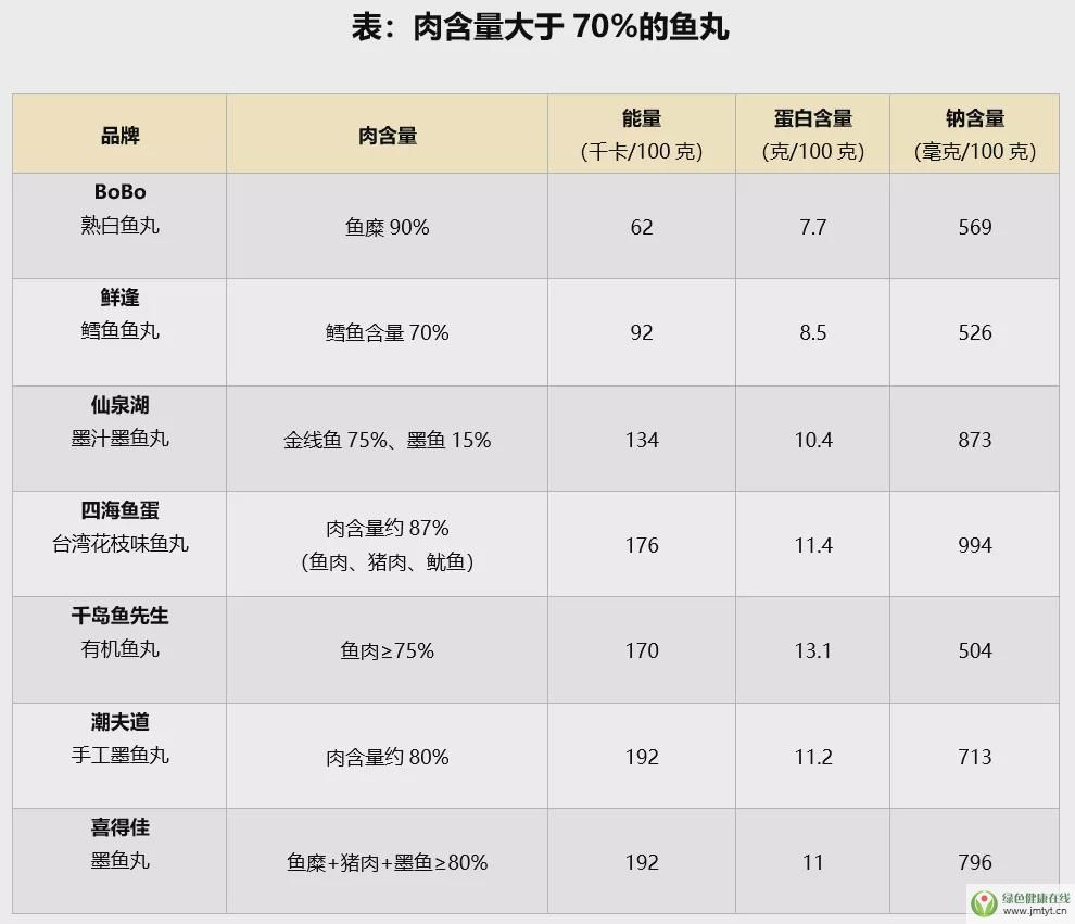 另外,我讓助理小伙伴幫忙搜了一下魚丸,結果發現下面這7款的魚糜或魚肉含量都在70%以上。
